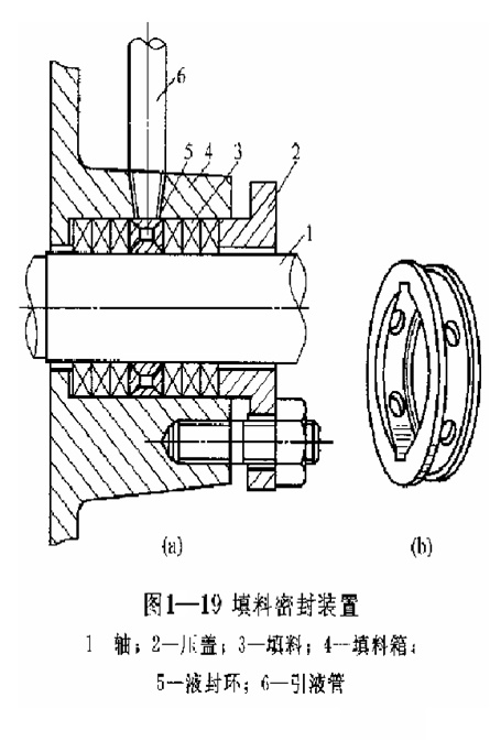 成液封,并冷卻潤滑填料。填料密封是通過填料壓蓋壓緊填料,使填料發(fā)生變形,并和軸(或軸套)的外圓表面接觸,防止液體外流和空氣吸入泵內(nèi)。填料密封的密封性可用調(diào)節(jié)填料壓蓋的松緊程度加以控制。填料壓蓋過緊,密封性好,但使軸和填