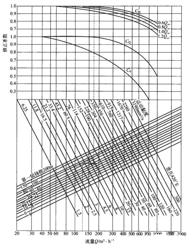 ①根據(jù)工藝要求的流量Qv、揚(yáng)程Hv,查圖2、圖3得到黏性介質(zhì)修正系數(shù)CQ、CH、Cη。圖2、圖3的使用條件如下。
