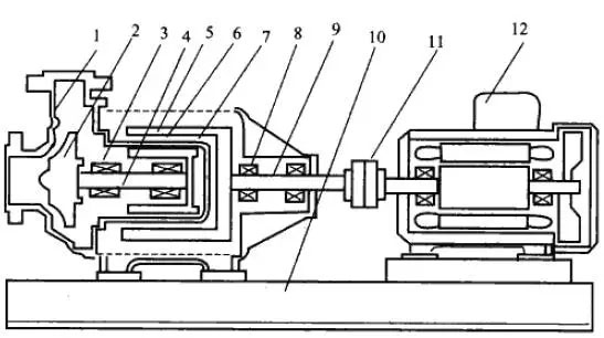 1—泵體;2—葉輪;3—滑動(dòng)軸承;4—泵內(nèi)軸;5—隔離套;6—內(nèi)磁鋼;7—外磁鋼;8—滾動(dòng)軸承;9—泵外軸;10—底座;11—聯(lián)軸器;12—電動(dòng)機(jī)