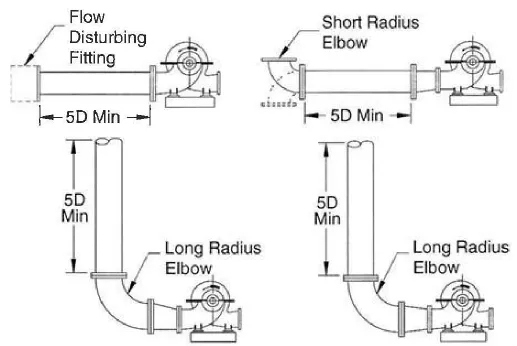 距離泵(入口法蘭至少)5倍吸入管徑內(nèi)不應(yīng)有干擾流量的配件(如部分打開的閥門、三通、短半徑彎頭等),完全打開的、無流量干擾的閥門、葉片式彎頭、長半徑彎頭和異徑管不被視為流量干擾配件(參見圖2和圖3)。