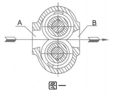 本型泵在泵體中裝有一對(duì)回轉(zhuǎn)齒輪,一個(gè)主動(dòng),一個(gè)被動(dòng),依靠?jī)升X輪的相互嚙合,把泵內(nèi)的整個(gè)工作腔分兩個(gè)獨(dú)立的部分。(圖一)A為吸入腔,B為排出腔。泵運(yùn)轉(zhuǎn)時(shí)主動(dòng)齒輪帶動(dòng)被動(dòng)齒輪旋轉(zhuǎn),當(dāng)齒轉(zhuǎn)從嚙合到脫開(kāi)時(shí)在吸入側(cè)(A就形成局部真空,液體被吸入。被吸入的液體充滿齒輪的各個(gè)齒谷而帶到排出側(cè)(B,齒輪進(jìn)入嚙合時(shí)液體被擠出,形成高壓液體并經(jīng)泵的排出口排出泵外。