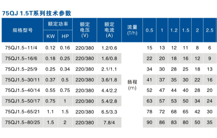 示例:75QJ1.5-11/4表示:井徑為75,流量為1.5,揚(yáng)程為11m,4葉輪的井用潛水電泵