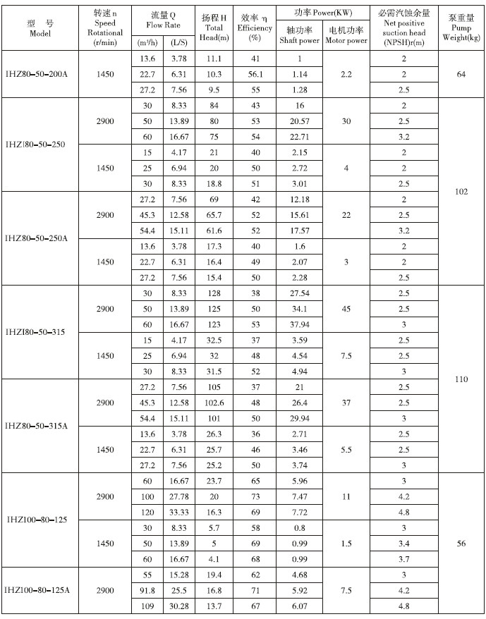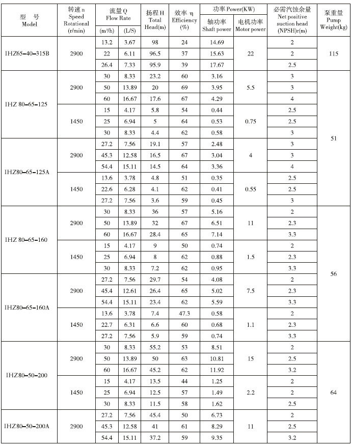 IHZ直聯(lián)化工離心泵性能參數(shù):