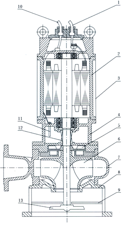 結(jié)構(gòu)特點說明 1、采用獨特的雙流道無堵塞葉輪結(jié)構(gòu),提高污水污物的過流能力和排污能力。 2、自動攪拌裝置,產(chǎn)生極強(qiáng)的攪拌力,將池內(nèi)的沉淀物攪拌成懸浮物后吸入葉輪排出,達(dá)到清淤的作用。 3、隔板將底座一分為二,攪拌與進(jìn)水互不影響。 4、機(jī)械密封為雙端面機(jī)械密封,長期處于油室中,保證水泵安全可靠地運行。 5、副葉輪結(jié)構(gòu)的流體動力密封,既有輔助密封作用,從而保護(hù)機(jī)械密封,又平衡軸向力,延長軸承的使用壽命。 6、泵連線腔內(nèi)沒有漏水檢測探頭,出現(xiàn)漏水時,探頭發(fā)出信號,控制系統(tǒng)對泵實施保護(hù),本公司可配全自動安全保護(hù)控制柜。 7、電機(jī)定子采用B級和F級絕緣,內(nèi)設(shè)熱保護(hù)器,當(dāng)電機(jī)過載發(fā)熱,保護(hù)器及時作出動作,對泵和電機(jī)實施絕對的保護(hù)。 8、油室內(nèi)裝有油水探頭,當(dāng)機(jī)械密封損壞后,水進(jìn)入油室,探頭發(fā)出信號由控制系統(tǒng)對水泵實施保護(hù)。 9、JPWQ帶內(nèi)循環(huán)冷卻系統(tǒng),能保證水泵在水池低水位正常工作。