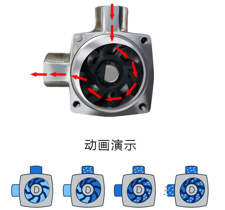 泵腔內(nèi)有一偏心凸塊,當(dāng)撓性葉片離開偏心塊時,葉片之間的容積不斷增大,產(chǎn)生真空,這使得液體不間斷地被吸入泵腔內(nèi)口部;當(dāng)撓性葉片旋轉(zhuǎn)時,液體由泵腔吸入部被帶入排出部;當(dāng)撓性葉片再次接觸到偏心凸塊時,產(chǎn)生彎曲,并伴隨著一個擠壓的動作,使得液體不間斷地,無脈動地排出泵腔,從而完成吸排的全過程。