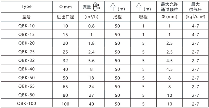 QBK不銹鋼氣動隔膜泵性能參數: