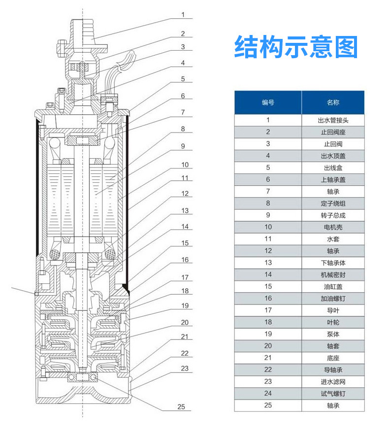 QX內(nèi)裝式潛水電泵由水泵、密封、電動(dòng)機(jī)、冷卻水套組成,電動(dòng)機(jī)位于電泵上部為三相異步電動(dòng)機(jī)結(jié)構(gòu),水泵位于電泵下部,為多級(jí)離心式葉輪徑向?qū)~結(jié)構(gòu),具有揚(yáng)程高外形小的特點(diǎn),水泵與電機(jī)之間采用兩道獨(dú)立的機(jī)械密封,各固定止口密封處采用“O”形耐油橡膠密封圈作靜密封,電動(dòng)機(jī)外套有鋼制冷卻水套,電泵工作時(shí),水流從水套和電動(dòng)機(jī)之間空隙通過,對(duì)電動(dòng)機(jī)和軸承有良好的冷卻作用,因此電泵上部可以露出水面工作。電泵轉(zhuǎn)軸經(jīng)鍍鉻處理,不易嗎磨損、腐蝕,切便于葉輪的維修和拆卸。11KW以下電機(jī)內(nèi)特配有圓盤式保護(hù)裝置,能在機(jī)內(nèi)溫度過高,過載,缺相,等異常情況下,切斷電壓保護(hù)電機(jī)。