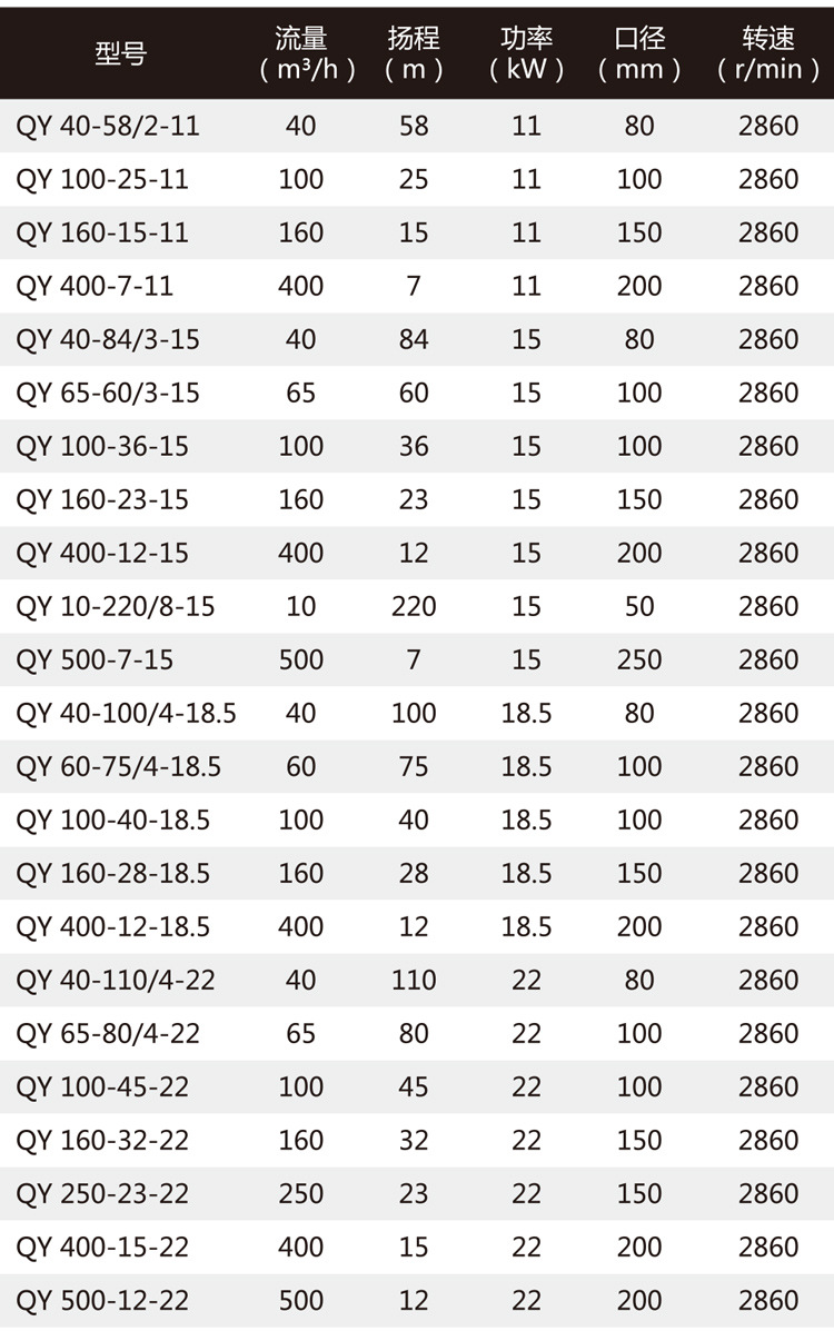 QY油浸式潛水電泵,充油式潛水泵性能參數(shù):