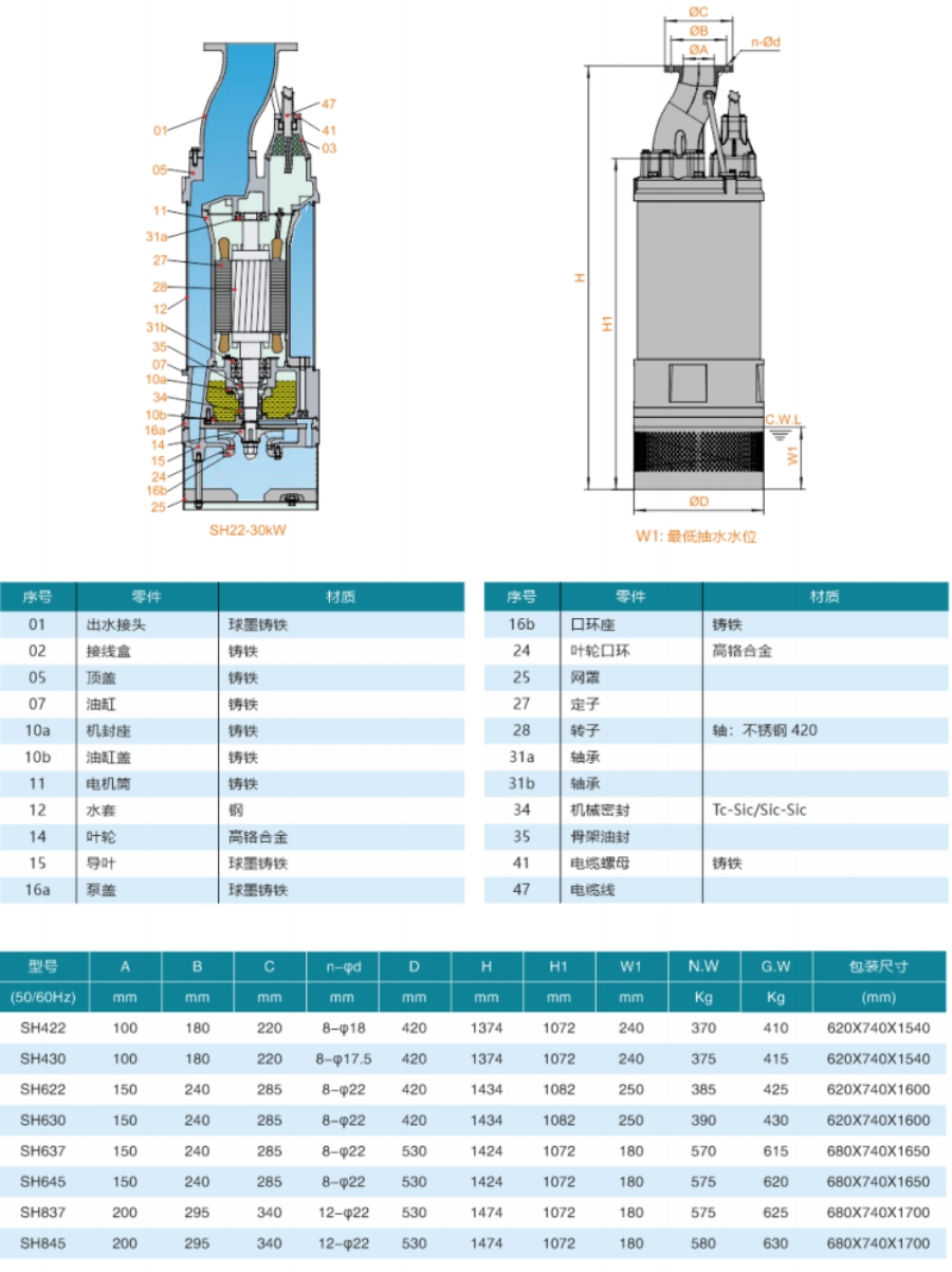 SH內(nèi)裝式潛水排污泵電動(dòng)機(jī)與泵體同軸直聯(lián),中間設(shè)有可靠的機(jī)械密封裝置;