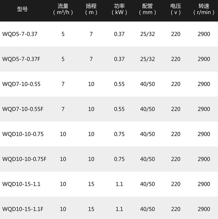 WQD220V帶浮球單相排污潛水泵性能參數(shù):