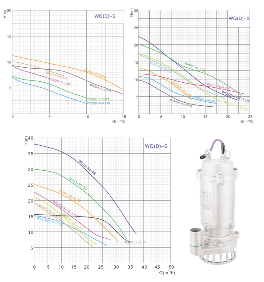 WQ-S小型不銹鋼潛水排污泵(單相/三相)性能曲線圖: