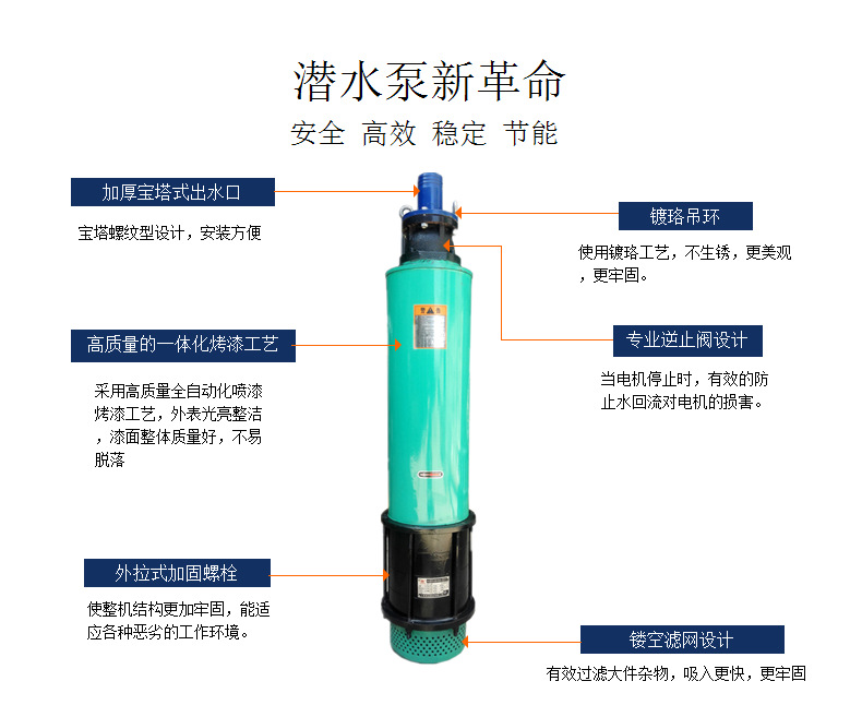 WQ下吸式污水電泵由潛水三相異步電動(dòng)機(jī)和污水泵兩大部分組成,電動(dòng)機(jī)與其下部的泵體直聯(lián),中間設(shè)有可靠的機(jī)械密封裝置,能有效的防止冷卻液與所抽