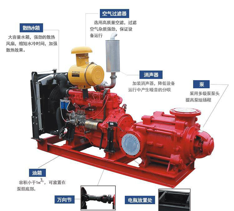 XBC柴油機消防泵與電器儀表等設(shè)備安裝在一起整套組合,具有功能齊全,自動化程度高,結(jié)構(gòu)緊湊,故障自動報警及接受啟動信號,自行完成起動程序,能快速投入全負荷運行。機組可按需求選配減振器、橡膠撓性接頭、排氣口配波紋管消音器。在燃料不足、蓄電池電壓低、潤滑油溫度高、超速等,備有報警裝置,確保柴油機低溫環(huán)境起動。整個系統(tǒng)安全可靠,使用方便。