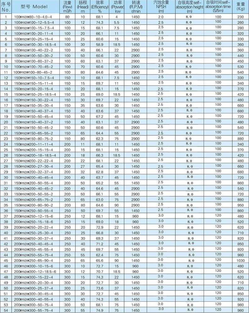 XZW系列大流量自吸泵是根據(jù)市場(chǎng)需求而開發(fā)的一種全新結(jié)構(gòu)的節(jié)能自吸泵產(chǎn)品。該大流量強(qiáng)自吸泵徹底解決了單吸式自吸泵的軸向拉力大、自吸時(shí)間長(zhǎng)、效率低等問題,具有吸程高、自吸時(shí)間短、使用效率高、節(jié)能效果顯著、運(yùn)行平穩(wěn),使用壽命長(zhǎng)等優(yōu)點(diǎn)。XZX清水型大流量自吸泵適用于輸送清水或輕度污水的場(chǎng)合,效率比污水型高,自吸性能好。XZXW大流量自吸排污泵集自吸和無堵塞排污于一體,采用軸向回流外混式,并通過泵體、葉輪流道的獨(dú)特設(shè)計(jì),既不需要安裝底閥和灌引水,又可吸排含有顆粒固體和纖維等雜質(zhì)的液體,可廣泛適用于市政排污工程、荷塘養(yǎng)殖、輕工、造紙、食品、化工、電業(yè)、纖維、漿料和混合懸浮等化工介質(zhì)理想的雜質(zhì)泵。XZC型柴油機(jī)式強(qiáng)自吸泵適用于各種復(fù)雜的應(yīng)急搶險(xiǎn)、消防等場(chǎng)合,不受電源、使用場(chǎng)地等因素的影響,可以移動(dòng)作業(yè),靈活性高。