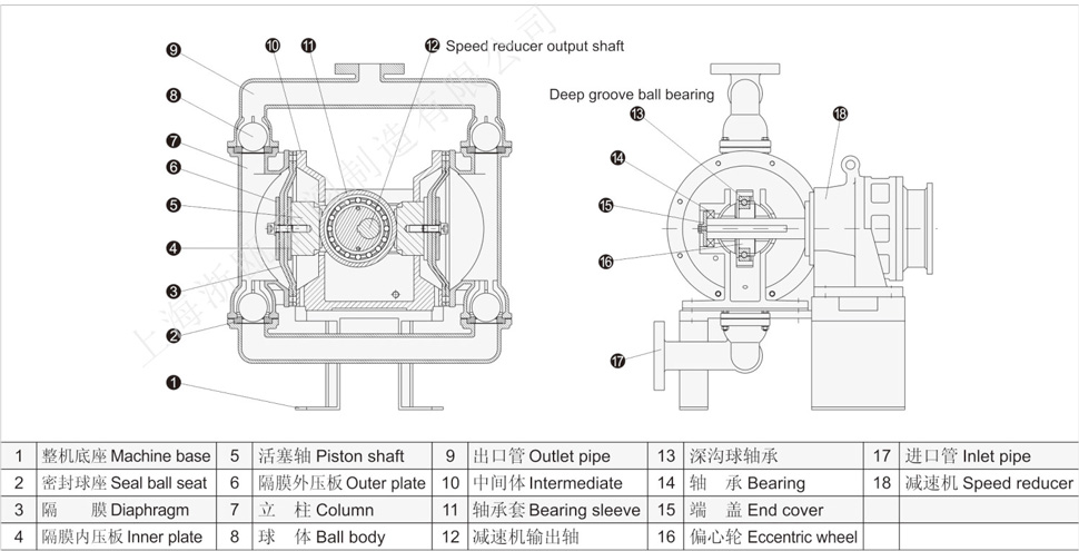 9、根據(jù)不同介質(zhì),隔膜分為氯丁橡膠、氟橡膠、丁腈橡膠、四氟乙烯,完全可以滿足不同用戶的需要。過(guò)流部件也可根據(jù)用戶要求,分為 鐵、不銹鋼、鋁合金,電機(jī)分為普通型隔膜泵和防爆型隔膜泵。