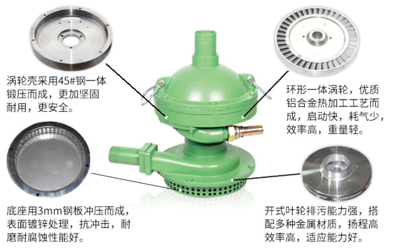 3.水泵部分:泵體,水輪,泵座等部件組成,泵體緊固于風(fēng)馬達(dá)機(jī)座上